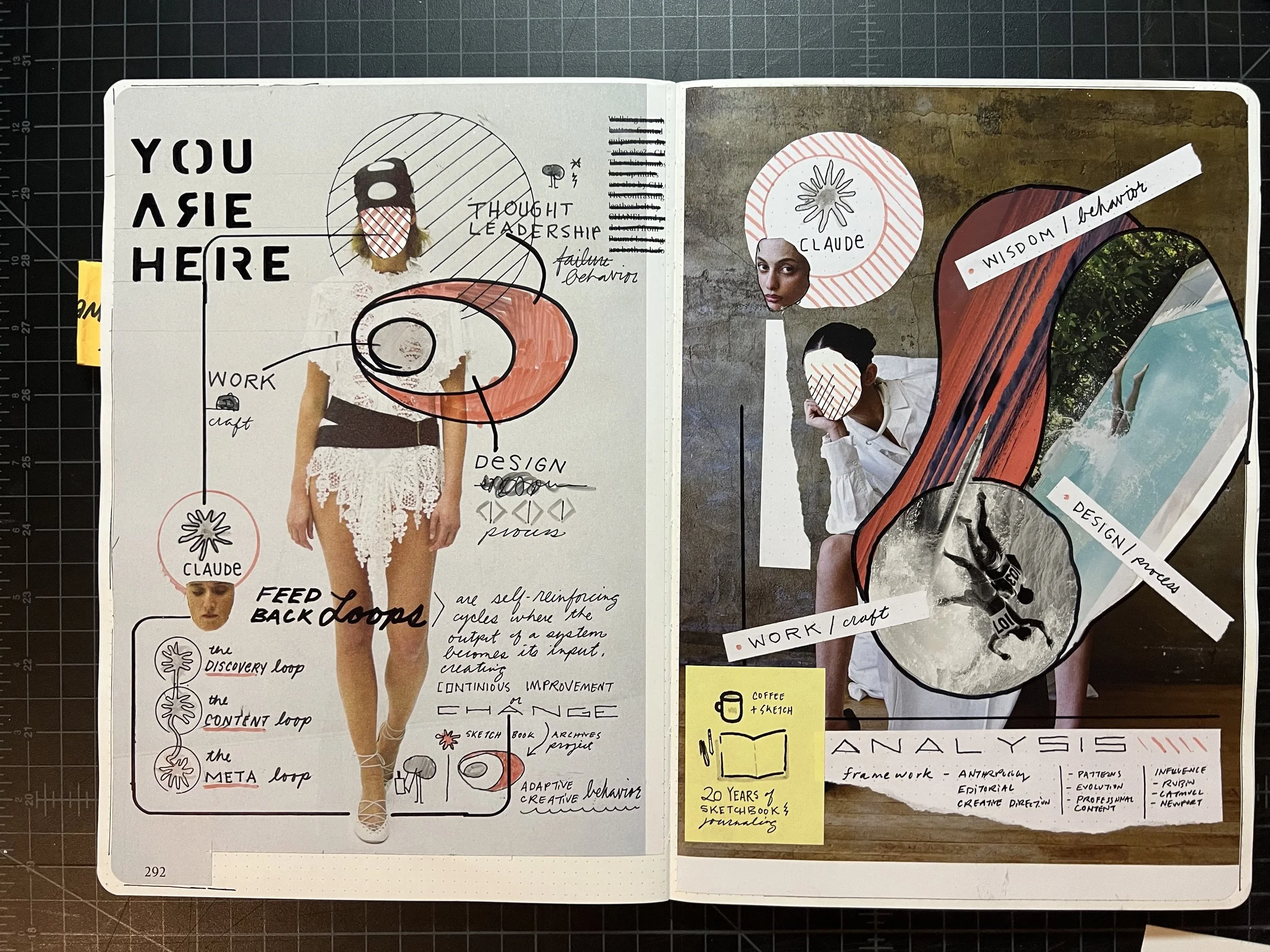 This sketchbook spread captures the moment I realized what was happening. The "YOU ARE HE(R)E" declaration on the left represents that recognition—we were at a unique creative inflection point where human intuition, generational perspective, and machine intelligence were creating something none of us could generate alone.